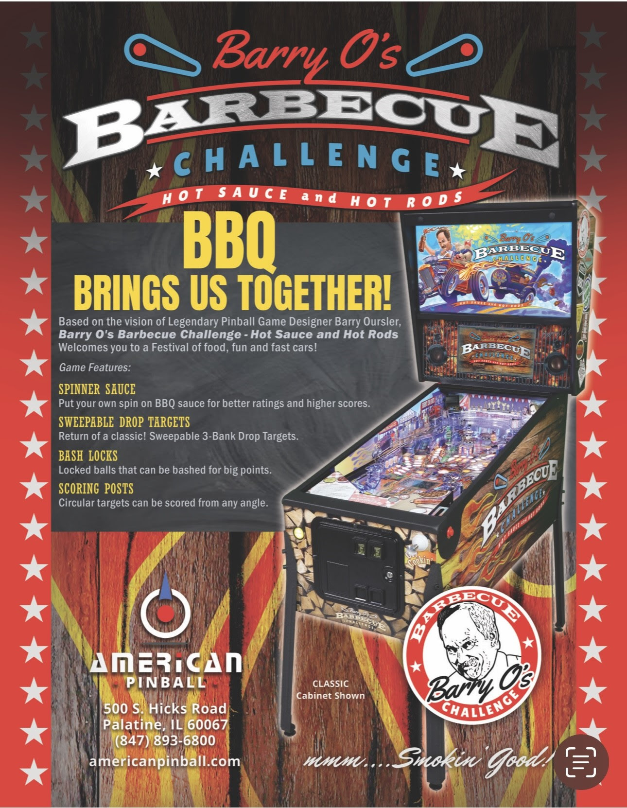 American Pinball is proud to announce Barry Oursler's final all-new design, commemorating his illustrious 46-year career in game design. In honor of Barry, we're excited to introduce ‘Barry O’s BBQ Challenge’ - a pinball adventure that captures the essence of summer fun and embodies the spirit of neighborhood BBQ Festivals across America. Available in two delectable editions - Limited and Classic - each game is seasoned to perfection, ready to become the centerpiece of your collection. Commemorating Barry's legacy, the royalties from 'Barry O's BBQ Challenge' will be directed to his estate, supporting his family and continuing his impactful contribution to the world of pinball.