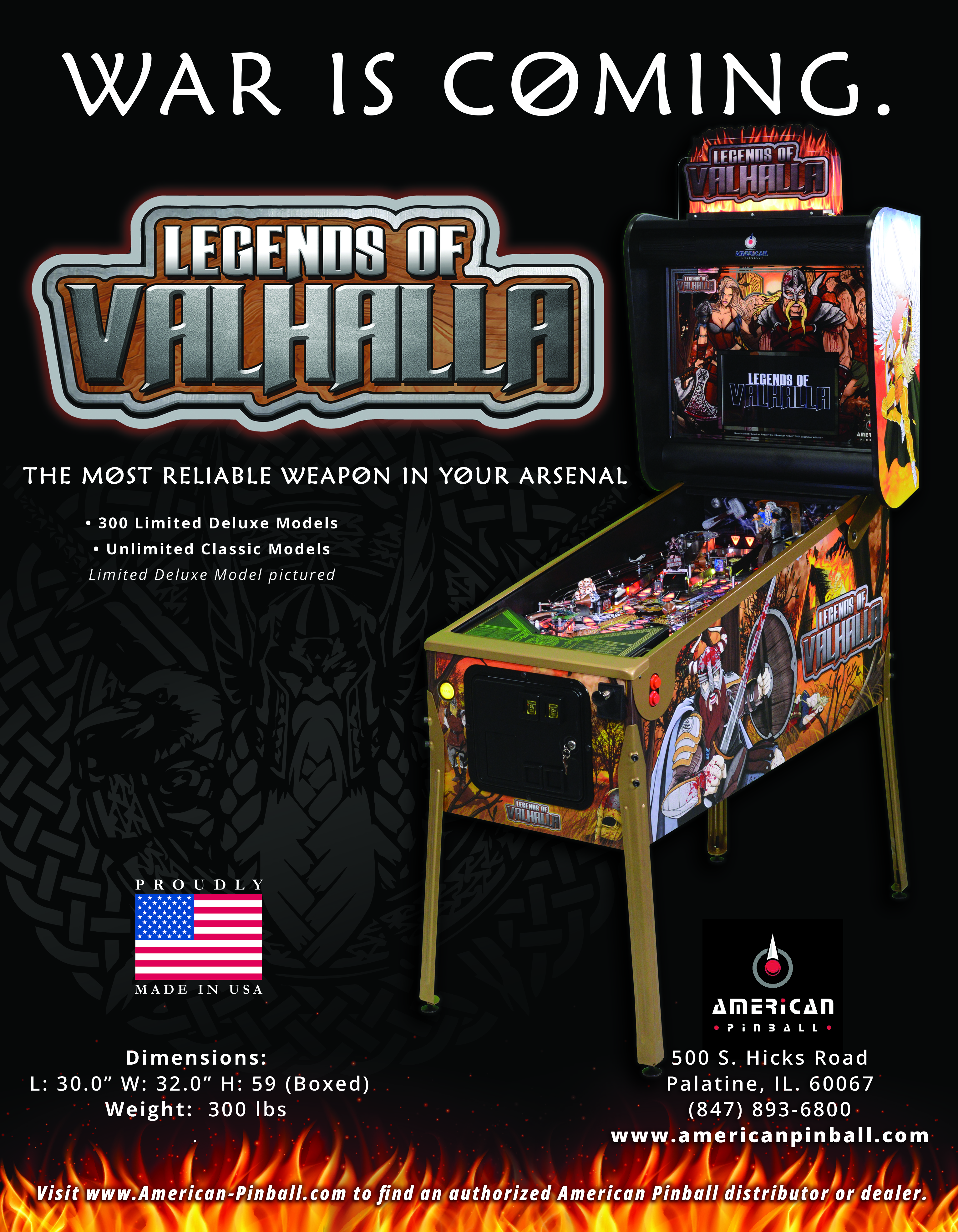 Legends of Valhalla, designed by Riot Pinball, is the 4th American Pinball title. Legends of Valhalla is an immersive pinball machine which brings the player into the world of the Norse gods and other Viking mythology. The game is a standard body design, utilizing three flippers offering a variety of fast and unique shots, including 3 metal ramps. The game rules have a variety of objectives that the player must either start or complete as they work their way through the game attempting to not only reach the wizard mode Valhalla, the majestic hall of dead Vikings, but also advance to the final epic battle known as Ragnarok, the super wizard mode.