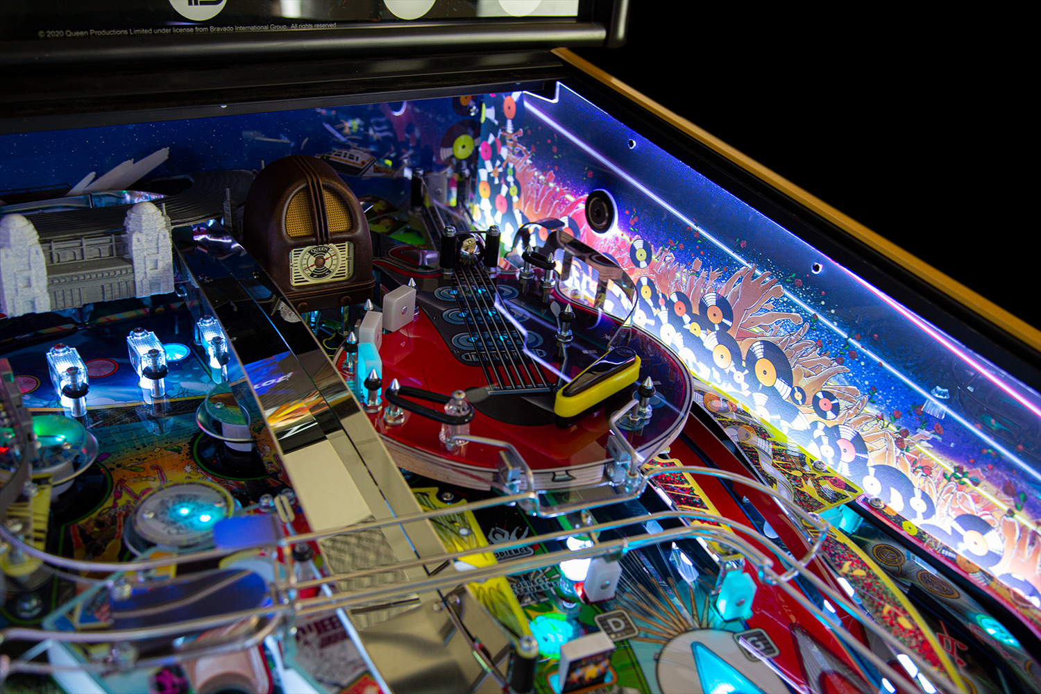 The game features 14 live songs accompanied by call outs by the band, exclusively recorded for the game. Featured also is Brian May’s legendary Red Special guitar, in the shape of an upper playfield where you can lock balls to start the Red Special multiball. Or you can visit the epic Wembley Stadium to lock balls